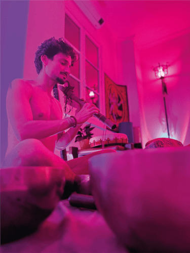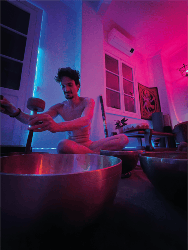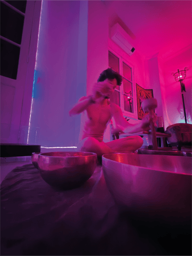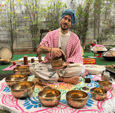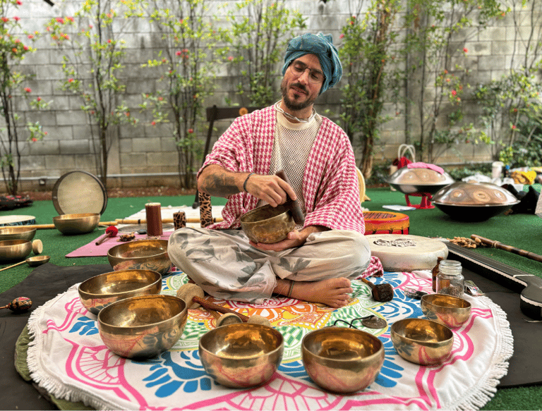 Vai ter taça tibetana, tambor, som da natureza, respiração ativa, e talvez um mantra que brota do nada quando o espírito baixa. É vibração, não é show do Lollapalooza. Em algumas práticas ha a utilização de taças tibetanas, tambores e paisagens sonoras está fundamentada na terapia vibracional e na harmonização de ondas alfa e teta no cérebro. O som funciona como guia para estados meditativos e amplificação da consciência, seguindo preceitos do Nada Yoga, a yoga do som.